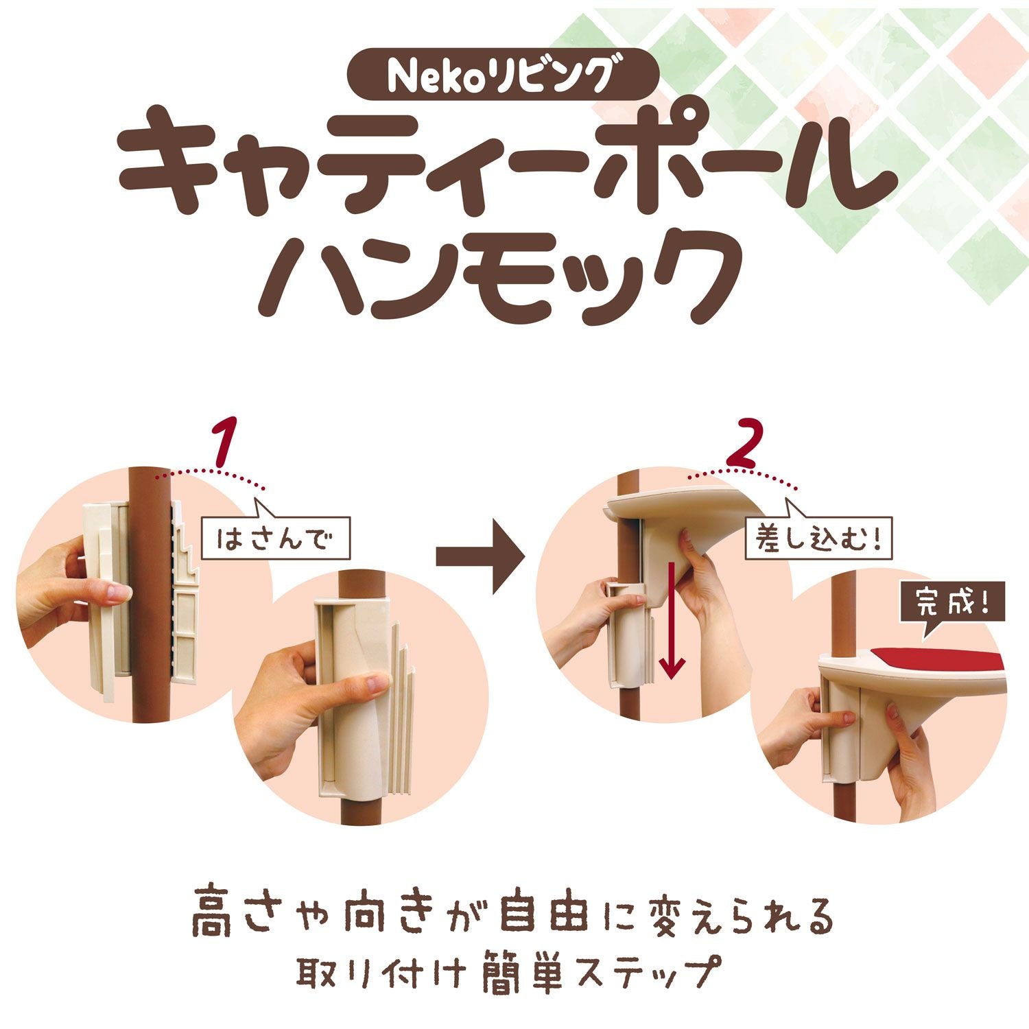 天井まで突っ張って設置できる省スペース型キャットタワー「Nekoリビング キャティーポール ハンモック付き」。